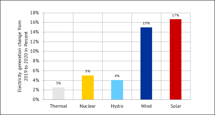 در نمودار زیر میزان تغییر در تولید برق توسط انواع انرژی ها بین سال 2019 تا 2020 نشان داده شده است. یکی از سیاست های راهبردی کشور چین، ضمن خودکفایی در تأمین انرژی های مصرفی خود، پیشتاز بودن در ساخت تجهیزات و تاسیسات انرژی های تجدیدپذیر برای امر توسعه صادرات در این زمینه هاست.