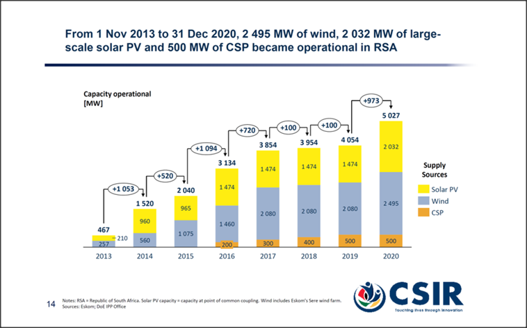 در نمودار زیر مقدار و سهم سه نوع انرژی اصلی تجدیدپذیر و همچنین مجموع و میزان افزایش سالانه این نوع انرژی ها در آفریقای جنوبی نشان داده شده است. بخشی از انرژی خورشیدی از نوع حرارتی (concentrated solar energy csp) بوده است. انرژی خورشیدی حرارتی یا انرژی متمرکز خورشیدی سیستمی است که با استفاده از آینه هایی، تابش آفتاب در یک نقطه متمرکز شده و حرارت مربوطه صرف گرم کردن آب می گردد. بخار آب، توربین و ژنراتور را به حرکت در می آورد تا برق تولید شود. در سال 2020 سهم انرژی های خورشیدی (فتوولتائیک)، بادی و خورشیدی حرارتی CSP از کل انرژی های تجدیدپذیر به ترتیب 40.4 درصد، 49.6 درصد و 10 درصد بوده است.