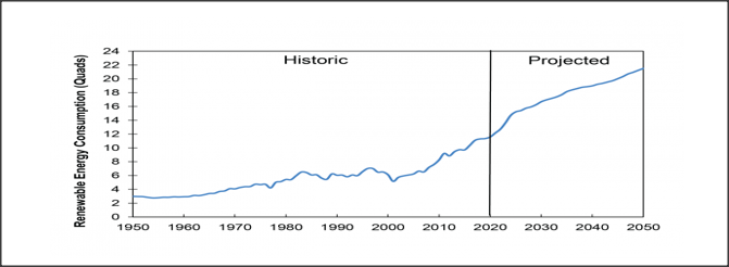 البته بر حسب سناریوی جدید حزب دموکرات و طبق نمودار زیر، رشد شتابان مصرف انرژی های تجدیدپذیر آمریکا طی سه دهه آینده (بر حسب کادتریلیون بی.تی.یو) نشان داده شده است. مقداری از این رشد مدیون رقابت سهمگین چین در این زمینه، قسمتی ناشی از مشوق های سخاوتمندانه دولت جدید و بخشی دیگر در نتیجه کاهش مقاومت شرکت های قدرتمند بین المللی نفتی و سرمایه گذاری های آنها در انرژی های تجدیدپذیر است.