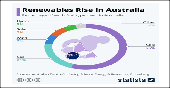 در واقع این حجم از سرمایه گذاری ها واکنشی اقتصادی برای جبران عقب ماندگی استرالیا نسبت به کشورهای پیشرفته جهان در این زمینه بوده است. با وجود تلاش زیاد، هنوز سهم انرژی های تجدیدپذیر این کشور از 19 درصد در سال 2020 فراتر نرفته است. ضمن اینکه همچنان سهم سوخت های زغال سنگ و گاز طبیعی از سبد انرژی های مصرفی کشور بیش از سه چهارم است (نمودار زیر). خاطر نشان می سازد استرالیا در کنار قطر و اخیرا آمریکا بزرگترین صادرکنندگان گاز مایع در جهان محسوب می شوند. انتظار می رود استرلیا با تداوم سرمایه گذاری های مزبور، وضعیت تولید و مصرف انرژی های تجدیدپذیر خود را تا سال 2030 به سطح کشورهای پیشرو برساند، تا بدین ترتیب ضمن کاستن از میزان وابستگی به مصرف انرژی های فسیلی (برای صدور آنها)، به اهداف کنترل گازهای گلخانه ای خویش نایل گردد.