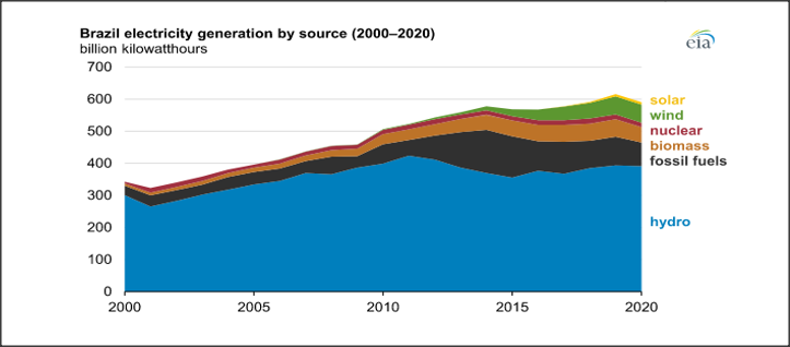 روخانه های پرآب به ویژه در مناطق شمالی رودخانه آمازون، منشأ اصلی تولید انرژی برق- آبی است. از مشکلات مهم انرژی برق-آبی، عواملی چون فاصله زیاد نیروگاه ها تا مراکز بزرگ مصرف در جنوب شرقی کشور، ملاحظات خشکسالی و جنگل زدایی گسترده در برزیل است. همین موضوعات، تکیه بیش از حد بر انرژی برق-آبی در برزیل را مورد نقد قرار داده است. از آنجایی که قریب 45 درصد از تقاضای انرژی اولیه این کشور توسط انرژی های تجدیدپذیر تأمین می شود، لذا برزیل یکی از پیشروترین کشورها در این زمینه است.