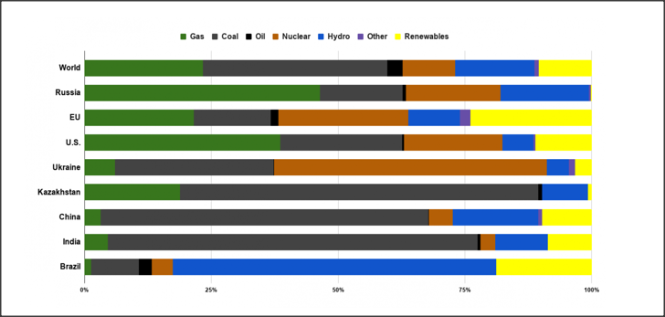 در سال 2020 مقدار تولید برق از انرژی های برق-آبی 212 تراوات (با سهم 20 درصد)، انرژی هسته ای 216 تراوات (با سهم 20 درصد) و سایر تجدیدپذیر جدید 3.5 تراوات (با سهم بسیار ناچیز 0.3 درصد از کل) بوده است. اما میزان رشد سال 2020 نسبت به سال قبل از آن در سه زمینه انرژی های تجدیدپذیر، برق-آبی و هسته ای به ترتیب 92 ، 9 و 3 درصد بوده است. در نمودار زیر (که در سال 2019 توسط BP تهیه گردیده) وضعیت بسیار غیر متوازن نقش انواع انرژی ها در تولید برق توسط روسیه نسبت به میانگین جهانی، اتحادیه اروپا، سایر کشورهای عمده و حتی اوکراین نشان داده شده است. در این سال میانگین انرژی های تجدیدپذیر در سطح جهان بالای 10درصد و اتحادیه اروپا بیش از 20 درصد بوده است.