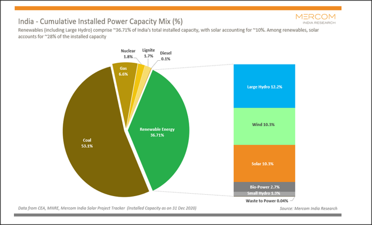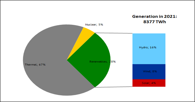 هند- در سال 2020 کشور هند به لحاظ تولید انرژی بادی رتبه چهارم و خورشیدی رتبه پنجم و به لحاظ نسبت مجموع تولید انرژی تجدیدپذیر ( 136 گیگاوات) به کل ( 373 گیگاوات) به میزان 36.71 درصد سومین رتبه جهان را دارا بوده است. این کشور علاوه بر نیروگاه های برق-آبی بزرگ (با سهم 12.2 درصد)، توجه زیادی به نیروگاههای کوچک (با سهم 1.3 درصد) برای تأمین مصارف محلی مبذول می کند. اما حدود 53.1 درصد مصرف انرژی هند (معادل 200 گیگاوات تأسیسات نصب شده) مبتنی بر سوخت زغال سنگ است و لذا مقدار تولید گازکربنیک و ذرات معلق هند بسیار بالاست (نمودار زیر). به منظور دستیابی به اهداف پیمان کاپ 26، دولت هند هدف بلندپروازانه دستیابی به ظرفیت نصب شده تجدیدپذیر 450 گیگاوات در سال 2030 را تعیین کرده است.